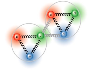 Oddziaływanie silne wiąże kwarki w protony i neutrony. Protony i neutrony z kolei łączą się tworząc jądra za pomocą szczątkowej postaci oddziaływania silnego, czyli zjawiska podobnego do oddziaływania van der Waalsa.