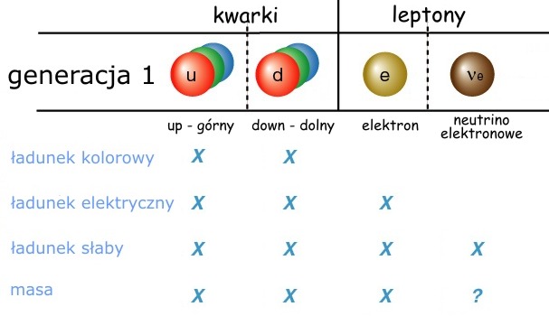 Nie wszystkie cząstki są obdarzone "ładunkami" związanymi ze wszystkimi typami oddziaływań. Oznacza to, że nie wszystkie doznają wszelkich oddziaływań występujących w przyrodzie. Tabela poniżej pokazuje, jakie własności posiadają cząstki należące do najlżejszego pokolenia...